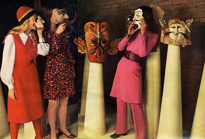 Apparently these girls (if they are all girls; the one on the far right may be a Beatle) have broken into the Hall of Masks at the local museum, and are gleefully trying on new faces. "I'm Chun Li!" "Check me out, I'm Stalin!" "I'm either Guy Fawkes or Captain Morgan! Wee!" Meanwhile, the other masks are sneaking up on them, planning to kill and eat their souls.