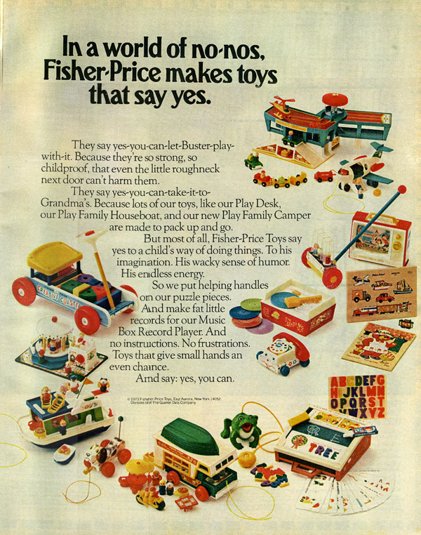 There's nothing terrible about this particular ad; it's included for nostalgia value only. The little desk in the bottom right-hand corner? I totally had that! The phone with eyes, too, and the record player, and the Little People airplane, and the thing that looks like a TV and plays "Pop Goes The Weasel" while a lenticulated "animation" plays on the "screen"!