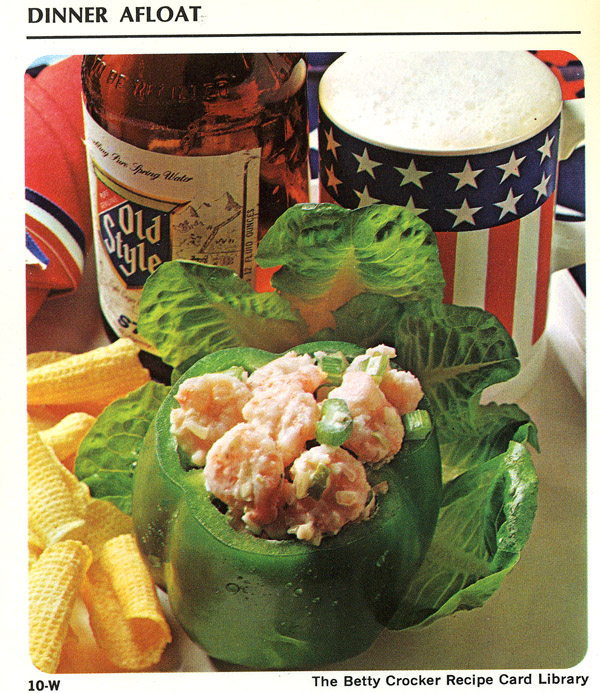 And once more for the win! I'm not sure I quite comprehend the point of this card. It's apparently saying that a bottle of beer, an empty American flag mug, some potato chips, and a shrimp-stuffed bell pepper wrapped in a lettuce leaf are the epitome of sea-going fare, but they don't say why.